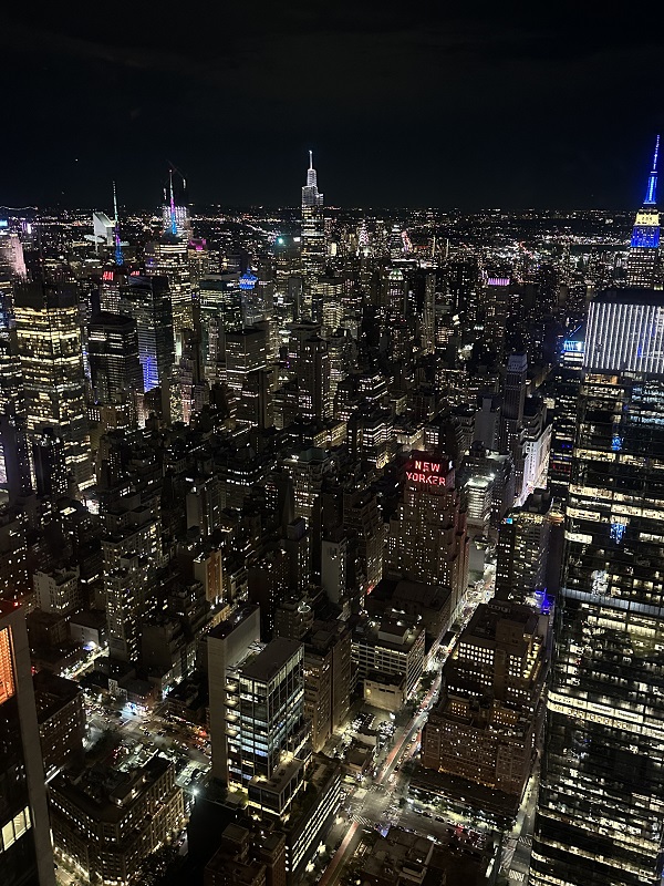 Danach wurde uns mitgeteilt, dass der Flug zwei Stunde Verspätung haben wird. Dies war jedoch nicht weiter schlimm, da wir ihn so wenigstens nicht verpassen konnten. Für einige von uns war es der erste Flug, umso größer war die Aufregung davor. Insgesamt ging unser Flug nach New York neun Stunden. Endlich in New York angekommen mussten wir durch den Immigrationsschalter, wo wir beinahe drei von uns verloren hätten, da einer Mitarbeiterin ein "student exchange" verdächtig vorkam. Anschließend fuhr unser Shuttle uns zum Hostel, welches schön zentral in Manhattan (500 Meter entfernt vom Central Park) lag. Kaum waren unsere Koffer im Zimmer, ging es zügig weiter, denn wir hatten Tickets für die Aussichtsplattform auf dem neuen Wolkenkrater „The Edge“. Nach kurzer Diskussion zwischen Lehrern und Mitarbeitern durften wir auch eine Stunde verspätet unser Gruppenticket einlösen. In 335 Metern Höhe konnten wir als erstes und eindrucksvolles Erlebnis New York City bei Nacht sehen.