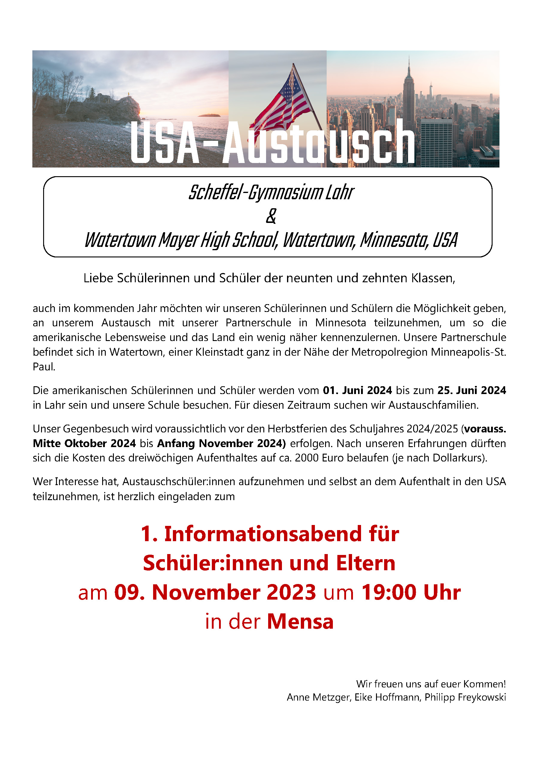 Nachdem wir Ende letzten Schuljahres nach längerer Coronapause endlich wieder die Amerikaner im Rahmen unseres Schulaustauschs empfangen haben, ging es nun auch für die Schüler 14 Schüler aus der 11.Klasse des Scheffels in die USA. Hier eine kleine Zusammenfassung unserer Reise:
