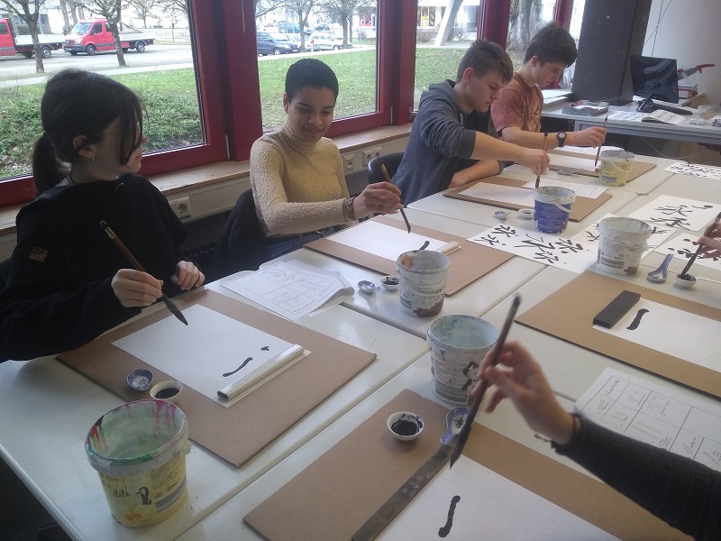 In der Verbindung von Kunst und Kunstgeschichtskenntnis ist er einzigartig in Süddeutschland. In einem Theorieteil ging es zuerst um die Geschichte der Kalligraphie, danach übten sich die Schülerinnen und Schüler in einem Praxisteil an Pinselschwüngen mit Tusche.