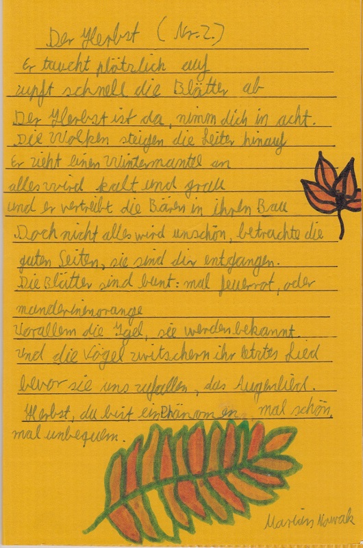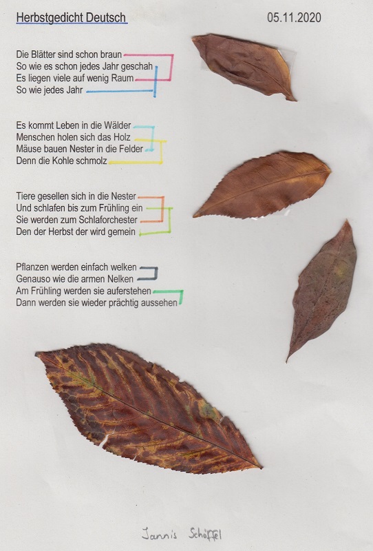 Im Rahmen des Deutschunterrichtes sind in der Klasse 7c einige tolle Gedichte rund um den Herbst entstanden.