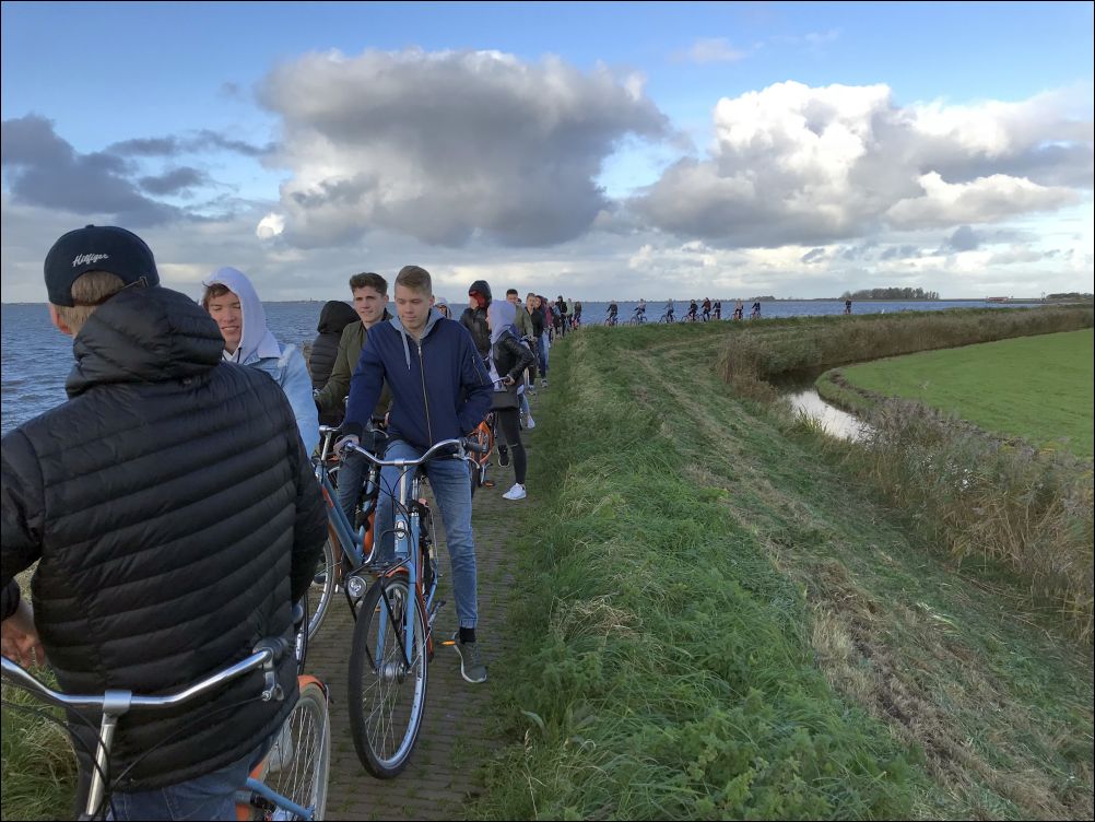 An diesem Tag stand uns eine sehr anstrengende Fahrradtour bevor. Wir fuhren knappe (oder mit den Worten von Frau Kurz: „Schlappe“) 30km auf schweren und schwergängigen Hollandrädern, die sicherlich nur zum Cruisen in der Stadt gedacht sind, bis wir unser Ziel, ein kleines Restaurant mit Ausblick auf das Markenmeer, den südlichen Teil des großen holländischen Binnenmeers (im Norden: Ijsselmeer), erreichten, wo wir dann auch zu Mittag aßen und uns trockneten und aufwärmten. Bei der Hinfahrt hätte uns Lorenz fast verlassen, da er einen Platten hatte und das Hostel versäumt hatte, uns Flickzeug mitzugeben. Glücklicherweise trafen wir einen Ornithologen am Wegesrand, der uns aushelfen konnte und so konnte die Reise weitergehen. Nach einer gut anderthalbstündigen Rückfahrt mit etwas Rückenwind und diesmal auf direktem Weg erreichten wir dann auch unser Hostel. Während der Rückfahrt verirrten sich allerdings einige Schüler und erreichten das Hostel dann etwas verspätet. Aber immerhin haben alle 35 Reiseteilnehmer die Tour von Anfang bis Ende durchgehalten.