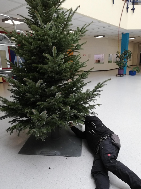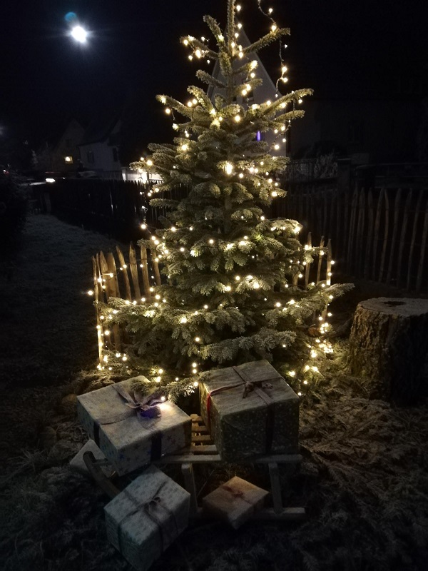 Donnerstag, 23.12.2021: Es geht weiter… Der Scheffel-Christbaum, der in der Adventszeit unsere Aula stimmungsvoll verschönerte, hat noch ein weiteres Zuhause gefunden: bei Frau Firgau vor dem Haus. Abschmücken, Abbauen, Abtransport nach Süden und Aufbau vor einem wunderschönen gelben Haus, jetzt leuchtet er wieder fröhlich und glücklich.