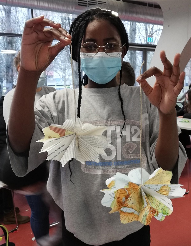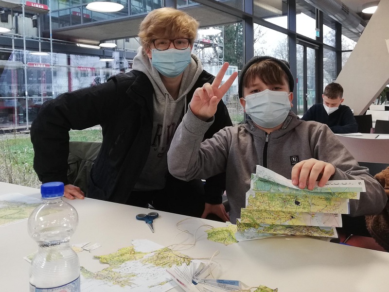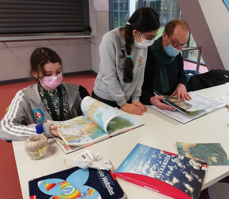 Dienstag, 21.12.2021: Weihnachtsabschluss mit der Lernwerkstatt. Schüler*innen der 5. und 6. Klassen bastelten mit den Jugendbegleiter*innen zunächst Sterne aus Atlas-Karten. Die wegen Renovierungsarbeiten im Geo-Fachraum ausgemisteten Atlanten wurden vorher aus der Altpapiertonne geholt.Die Kinder durften ihr Herkunftsland aus dem Atlas suchen und daraus dann einen Stern basteln.