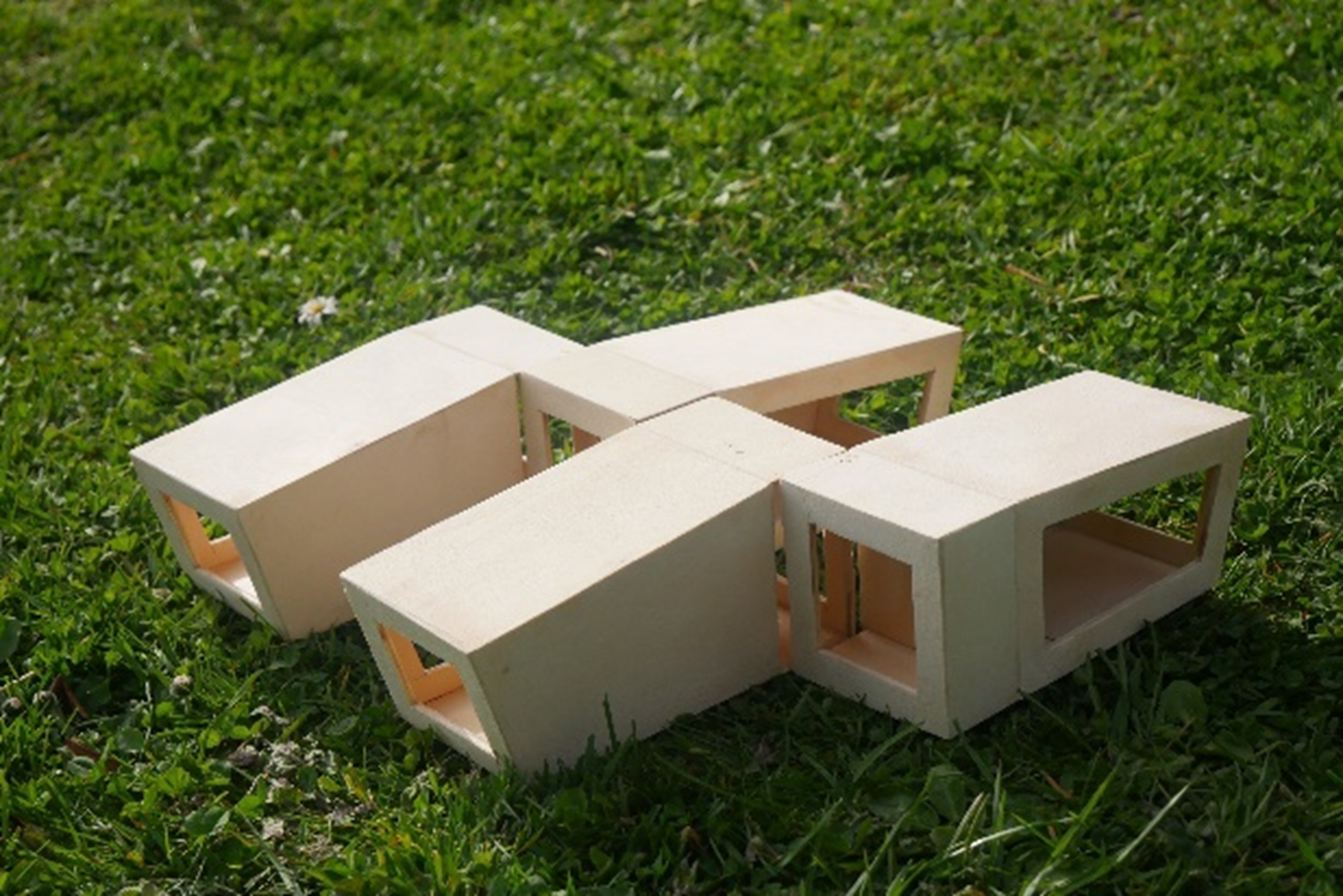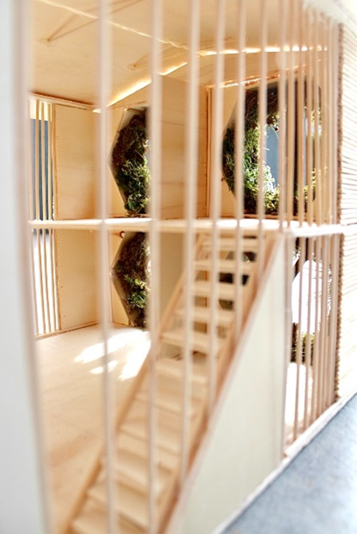 Das Modell „Honeycomb“ (Abb. 7) von Olivia, Eduard, Laura, Farah, Alexandra und Adeeba legte großen Wert auf die Nachhaltigkeit und den Erhalt der Biodiversität. Die wabenförmige Form (Abb. 8) für die Fenster soll auf die Wichtigkeit der Bienen aufmerksam machen. Die Pflanzen vor den Fenstern bieten neben den Bienen auch zahlreichen anderen Insektenarten einen Lebensraum und wirken mit ihrer CO2-Aufnahme dem Treibhauseffekt entgegen. Im Winter dringt Licht und somit auch Wärme durch die großen Glasscheiben in das Gebäude (Abb. 6). Vorteile des Gebäudes sind, dass nicht nur das helle Holz, sondern besonders die Begrünung einen positiven Einfluss auf die menschliche Psyche haben. Die Jury lobte den Holzbau, die Begrünung und den Fokus auf die Bienen. Auch die sorgfältige Arbeit wurde von den Architekten sehr gelobt. Sie würden sich wünschen, dass „in der Praxis errichtete Projekte solche Konzepte hätten“.