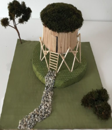 Die zweite Gruppe, bestehend aus Jana, Mina, Lukas, Franziska und Marie beschäftigte sich mit dem Thema „Nachhaltiges Wohnen in den Tropen“ (Abb. 4 und 5). Abgelegene Entspannungsorte als High-Tech-Häuser waren die Grundidee, die von jedem Gruppenmitglied individuell in einem Modell ausgearbeitet wurde. Die Häuser sind als Verbund zu betrachten, in dem einige Menschen autonom leben können. Begeistert war die Jury von der Idee des Rückzugsortes, des globalen Denkens und dass trotz der unterschiedlichen Gebäude eine Einheit gebildet wurde.