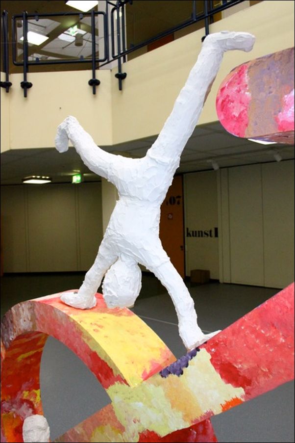 Ausgehend vom Ergebnis des Brainstorming („Bunt soll es werden“ – Chrysanthema als Lokalbezug – „Rad fahren macht Spaß“), entwickelten die 6.Klässler anhand von Bleistiftzeichnungen mögliche Kombinationen von Figur und Rad, während sich die 5.Klässler vor allem auf die malerische Umsetzung von Chrysanthemen konzentrierten. Um die Figur in ihren Proportionen zu erfassen, dienten Holzgliederpuppen als Vorlage. Farbfolien mit Chrysanthemen erleichterten am Anfang die Gestaltung des Styroporrades, welches im Verlauf zunehmend freier bemalt wurde, bis es der Folien gar nicht mehr bedurfte. Eine große Herausforderung bestand für diese Altersstufe darin, dass die Farbe mit großen Pinsel ausschließlich auf dem Modellrad gemischt werden sollte, um den blütenartigen Charakter zu verstärkten. Das innere Gerüst der Figuren besteht aus einem Drahtgitter, um das eine Zwischenschicht aus Papier und Fasermatte gelegt wurde. Diese überzogen die SchülerInnen mit Spachtelmasse. Die Reduzierung in Farbigkeit und in Form sollte hierbei den Stellvertretercharakter der Figuren verstärken. An den Stellen, an denen das Rad bereits bemalt war und die Figur angebracht werden sollte, wurde zum Schutz der Bemalung eine Folie angebracht, die nach der Verspachtelung wieder entfernt wurde.