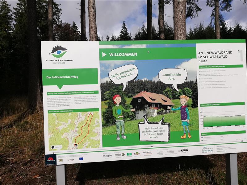 Angekommen in Schuttertal-Höfen trafen wir unseren Führer Steffen Praetorius, der Diplom-Geologe und Vater einer Schülerin ist, die leider krank war und aus diesem Grund nicht mitkommen konnte. Er war an der Erstellung des Pfades beteiligt und daher sehr sachkundig und versorgte uns den ganzen Weg über mit wichtigen und spannenden Informationen zur Erdgeschichte. Der Erdgeschichten-Pfad besteht aus insgesamt zehn Stationen.