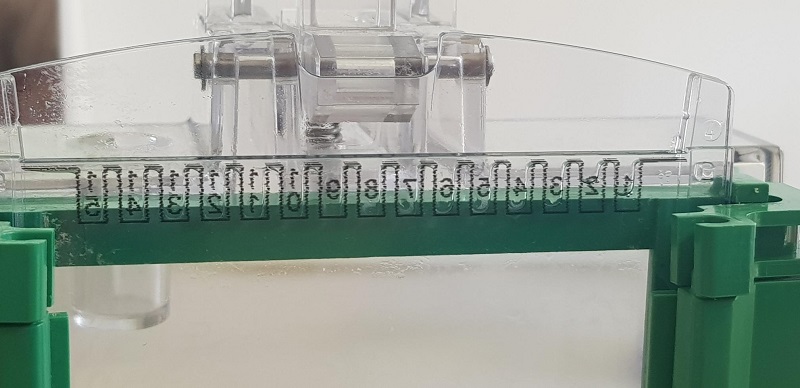 Zunächst füllten wir diese Proben mit der Laemmli- Puffer Lösung, übernahmen diese in einem Thermoblock und anschließend in einer Zentrifuge. In einer Geltasche wurden diese zentrifugierten Proben, also vorbehandelten DNA-Proben mit einer Pipette eingefüllt.