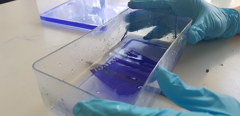 Schließlich haben wir das Gel bzw die Proteinbanden mit einem blauen Farbstoff (Coomassie Brilliant Blue) gefärbt und danach entfärbt, dann wieder gefärbt.