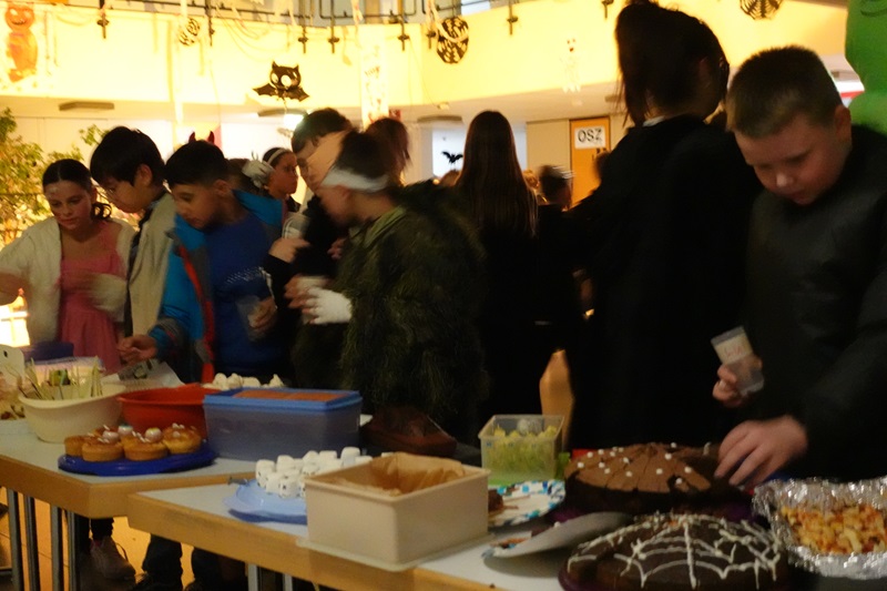 Die ganze Aula wurde gruselig dekoriert und man konnte ganz viele Verkleidungen bestaunen (es war ja Kostümpflicht J). Auch das Buffet war mit leckeren Snacks belegt.