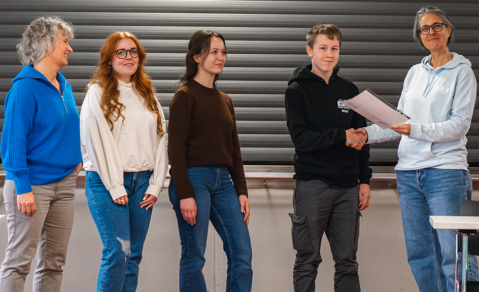 Auf der deutschen Seite das Bild der Klassen 7b und 7d, von Alessia Keil, Luisa Erlewein, Josef Nijim und Melina Rotärmel - hier unsere stolzen Gewinnerinnen: