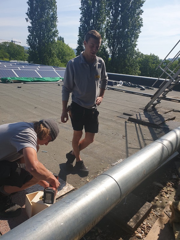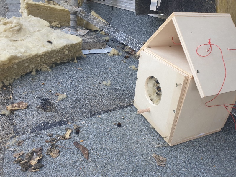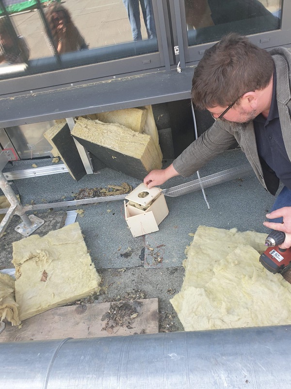 Immer wieder merken wir bei den Bauarbeiten an unserer Schule, dass sich die Natur unser Gebäude zurückerobern möchte. Selbstständige Renaturierung quasi. Da gibt es Efeu, der in Mauerritzen hineinwuchert und in Klassenzimmern wieder auftaucht, Grillen und Feldmäuse, die es sich unter Waschbeckenschränken und in Sofas des Oberstufenzimmers gemütlich machen, Rotschwänzchen, die sich im Gebälk der Lehrertoilette ein Nest bauen - und Hummeln, die sich die gemütlich aussehende Isolierwolle an den neuen Fenstern als perfektes Hummelnest ausgeguckt haben. So ein Hummelnest entdeckten unsere fleißigen Handwerker - und holten Herr Oelze und einige Schüler*innen zur Hilfe, die gemeinschaftlich die Hummeln behutsam in ein flugs zusammengeschraubtes Häuschen umquartierten.
