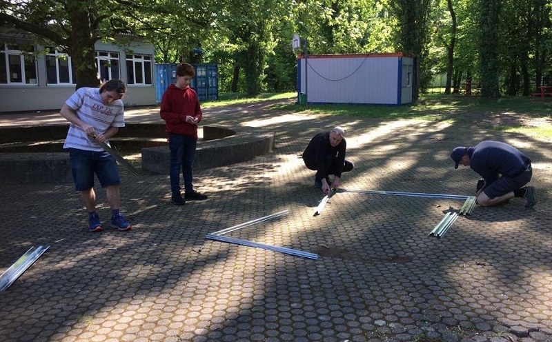 Immer wieder merken wir bei den Bauarbeiten an unserer Schule, dass sich die Natur unser Gebäude zurückerobern möchte. Selbstständige Renaturierung quasi. Da gibt es Efeu, der in Mauerritzen hineinwuchert und in Klassenzimmern wieder auftaucht, Grillen und Feldmäuse, die es sich unter Waschbeckenschränken und in Sofas des Oberstufenzimmers gemütlich machen, Rotschwänzchen, die sich im Gebälk der Lehrertoilette ein Nest bauen - und Hummeln, die sich die gemütlich aussehende Isolierwolle an den neuen Fenstern als perfektes Hummelnest ausgeguckt haben. So ein Hummelnest entdeckten unsere fleißigen Handwerker - und holten Herr Oelze und einige Schüler*innen zur Hilfe, die gemeinschaftlich die Hummeln behutsam in ein flugs zusammengeschraubtes Häuschen umquartierten.
