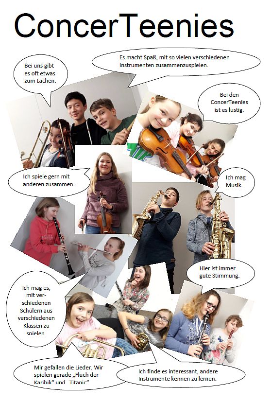 Das Besondere an diesem jungen Orchester ist das Zusammenspielen von Instrumentalanfängern (für die die Noten extra angepasst werden) und schon fortgeschritteneren Schülern, die dann mehr Verantwortung tragen. Wer aus den ConcerTeenies leistungsmäßig herausgewachsen ist, kann im Sinfonieorchester mitspielen, oder bei den ConcerTeenies als Mentor die Jüngeren unterstützen.