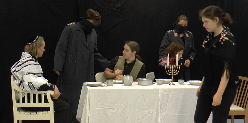 Streng jahrgangsgetrennte Proben, Treffen im Freien mit Abstand und Masken, Ton- und Video-Aufnahmen und pantomimisches Spiel ermöglichen trotz der strengen Hygienebestimmungen die Theater-Arbeit, bei der ja eigentlich Nähe, Kommunikation und Mimik essentiell ist, und es braucht Mut und Ideen für neue und andere Konzepte. So sollte im Rahmen der Gedenkveranstaltung für deportierte Juden aus Lahr eigentlich eine feierliche Kranzniederlegung am Denkmal auf dem Friedrich-Ebert-Platz stattfinden und anschließend eine kleine Veranstaltung im Pflugsaal, bei der wir live Theater gespielt hätten. Das klappt jetzt natürlich aufgrund der steigenden Zahlen nicht. Also musste unser Plan B in Angriff genommen werden: Wir haben mit allen Schülerinnen und Schülern der Theater-AG eine gesprochene Gedichtcollage aufgenommen und anschließend mit den beiden größeren Gruppen aus den Jahrgangsstufen 10 und 11 jeweils separat eine pantomimische Szene dazu gespielt und gefilmt. Das Ergebnis wurde am Mittwoch, den 21.Oktober, bei der Gedenkveranstaltung im Pflugsaal ausgewählten Gästen vorgeführt, die sich tief beeindruckt zeigten.