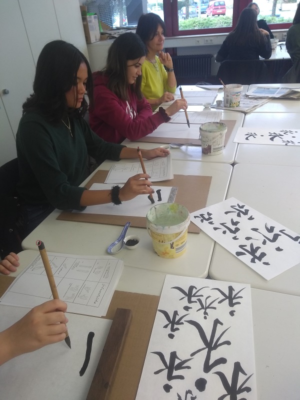 In der Verbindung von Kunst und Kunstgeschichtskenntnis ist er einzigartig in Süddeutschland. In einem Theorieteil ging es zuerst um die Geschichte der Kalligraphie, danach übten sich die Schülerinnen und Schüler in einem Praxisteil an Pinselschwüngen mit Tusche.