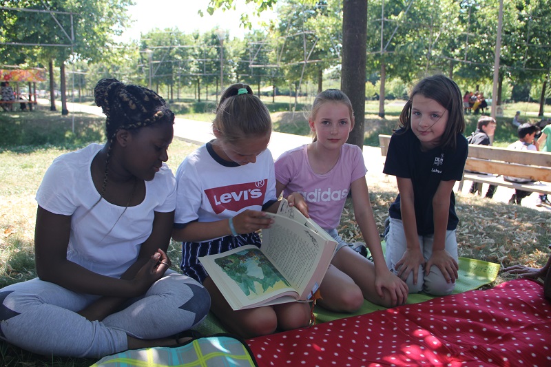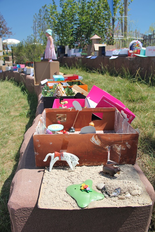 Hier blieben eigentlich alle Festbesucher eine Weile stehen und bewunderten die Kreativität bei der Gestaltung. Vor allem die jüngeren Zuschauer konnten sich kaum trennen, sie versuchten die Märchen zu raten und konnten sich gar nicht entscheiden, welche Kiste die schönste gewesen sein könnte. Beim Bühnenprogramm sagte Frau Lunkebein, die Leiterin des Bürgerzentrums K14, das Scheffelgymnasium an und die Schülerinnen stellten ihr Programm selbst vor. Im Schatten der Bäume hatten sie eine Leseecke eingerichtet und lasen aus einem großen Märchenbuch diejenigen Märchen vor, die sich die zuhörenden Kinder wünschten.