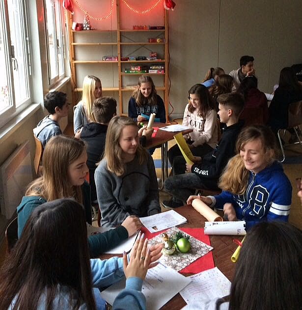 Die Klasse 8c des Scheffel-Gymnasiums feierte am 19. 12. 2017 zusammen mit der Deutsch-Vorbereitungsklasse der Friedrichschule ein interkulturelles Weihnachtsfest. Eingeladen waren zwölf Kinder und Jugendliche aus sieben verschiedenen Ländern mit ihrer Klassenlehrerin Frau Repp und mit Frau Berg, Lehrerin der gemeinnützigen Bildungsinitiative Teach First Germany. Lisa Thessen, Schulsozialarbeiterin am Scheffel und auch an der Friedrichschule, hat die Begegnung ermöglicht und koodiniert. Die weitere Umsetzung wurde von den Schülerinnen und Schülern der 8c selbständig geplant und organisiert.