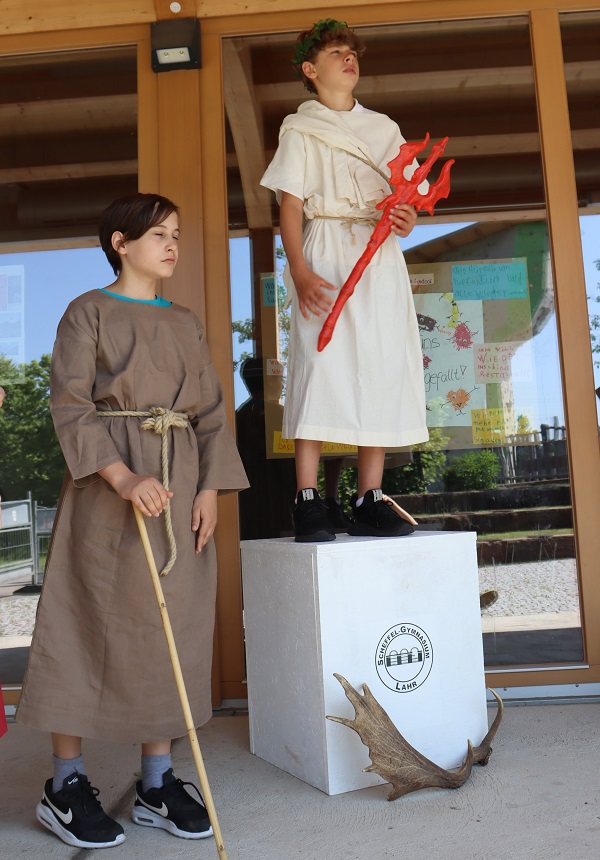 Deshalb wollte das Scheffel seine im vergangenen Jahr gemachte Zusage zur Teilnahme an der gallo-römischen Matinee im Bürgerpark gerne einhalten. Gesagt, getan: Die Klasse 8c bereitete am Montag im Lateinunterricht bei Frau Poster Monologe gallo-römischer Gottheiten vor, welche in das am Dienstag von der Klasse 6c selbstgeschriebene Theaterstück eingebaut wurden.