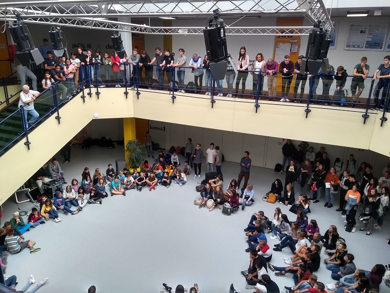 Mit einem kleinen "Sit-in" und einer Ansprache unserer Schulleiterin Sabine Rühtz an die gesamte Scheffel-Schulgemeinschaft starteten wir am Mittwoch alle gemeinsam in das neue Schuljahr 2019/2020 in der Aula - die (endlich!!!) mit neuem Boden, frisch gestrichenen bunten Säulen und großen Pflanzen in farbig lackierten Kübeln in neuem Glanz erstrahlte.
