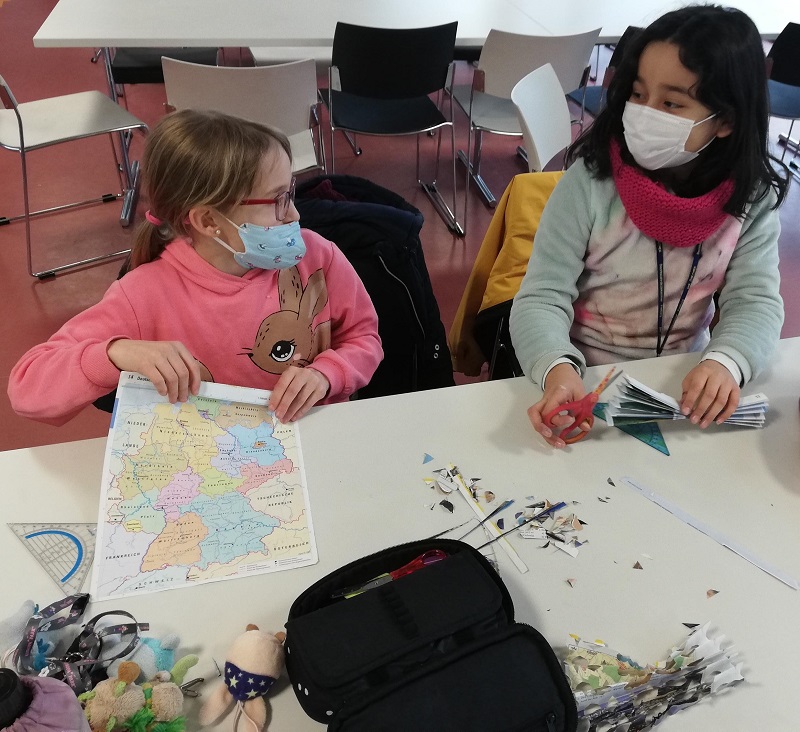 Dienstag, 21.12.2021: Weihnachtsabschluss mit der Lernwerkstatt. Schüler*innen der 5. und 6. Klassen bastelten mit den Jugendbegleiter*innen zunächst Sterne aus Atlas-Karten. Die wegen Renovierungsarbeiten im Geo-Fachraum ausgemisteten Atlanten wurden vorher aus der Altpapiertonne geholt.Die Kinder durften ihr Herkunftsland aus dem Atlas suchen und daraus dann einen Stern basteln.