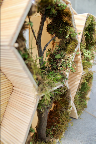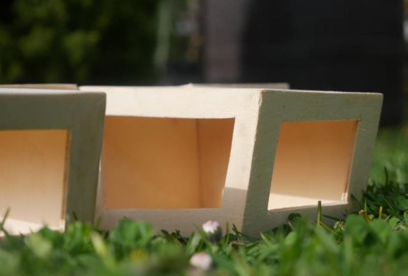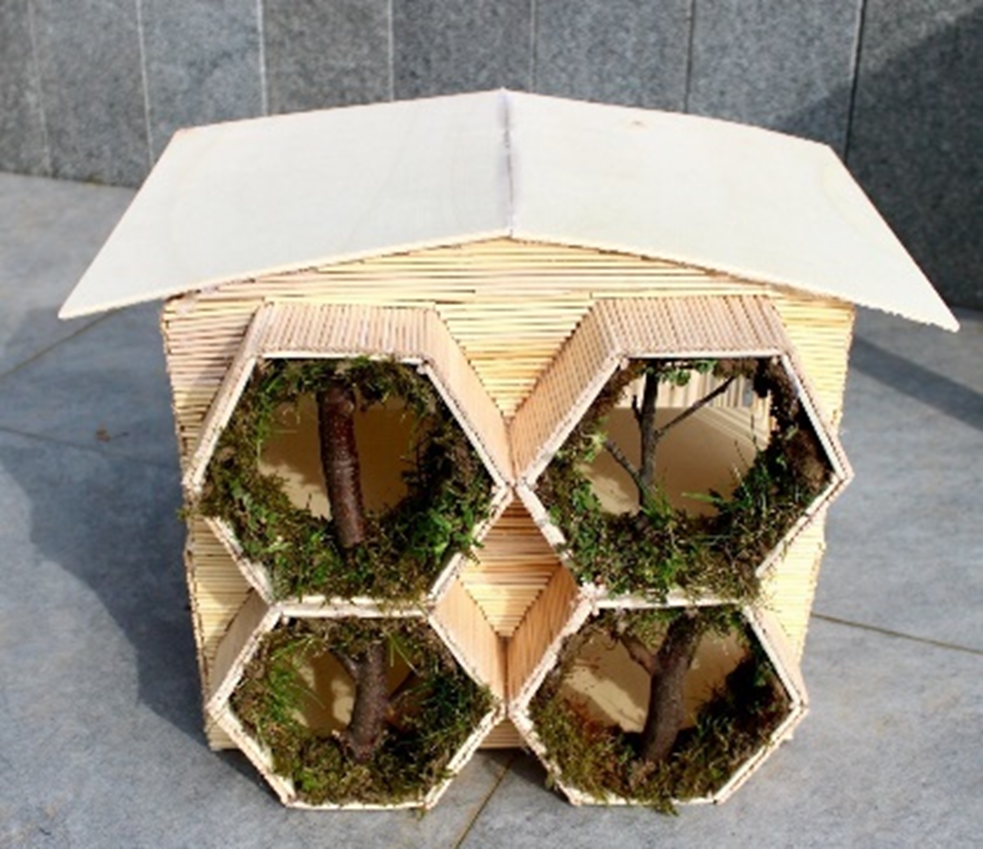Das Modell „Honeycomb“ (Abb. 7) von Olivia, Eduard, Laura, Farah, Alexandra und Adeeba legte großen Wert auf die Nachhaltigkeit und den Erhalt der Biodiversität. Die wabenförmige Form (Abb. 8) für die Fenster soll auf die Wichtigkeit der Bienen aufmerksam machen. Die Pflanzen vor den Fenstern bieten neben den Bienen auch zahlreichen anderen Insektenarten einen Lebensraum und wirken mit ihrer CO2-Aufnahme dem Treibhauseffekt entgegen. Im Winter dringt Licht und somit auch Wärme durch die großen Glasscheiben in das Gebäude (Abb. 6). Vorteile des Gebäudes sind, dass nicht nur das helle Holz, sondern besonders die Begrünung einen positiven Einfluss auf die menschliche Psyche haben. Die Jury lobte den Holzbau, die Begrünung und den Fokus auf die Bienen. Auch die sorgfältige Arbeit wurde von den Architekten sehr gelobt. Sie würden sich wünschen, dass „in der Praxis errichtete Projekte solche Konzepte hätten“.