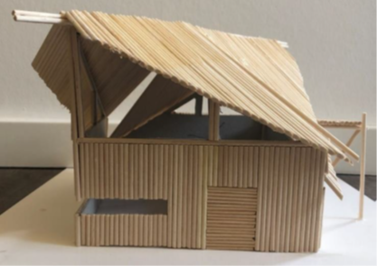 Die zweite Gruppe, bestehend aus Jana, Mina, Lukas, Franziska und Marie beschäftigte sich mit dem Thema „Nachhaltiges Wohnen in den Tropen“ (Abb. 4 und 5). Abgelegene Entspannungsorte als High-Tech-Häuser waren die Grundidee, die von jedem Gruppenmitglied individuell in einem Modell ausgearbeitet wurde. Die Häuser sind als Verbund zu betrachten, in dem einige Menschen autonom leben können. Begeistert war die Jury von der Idee des Rückzugsortes, des globalen Denkens und dass trotz der unterschiedlichen Gebäude eine Einheit gebildet wurde.