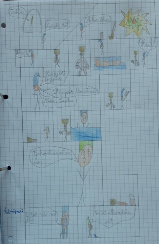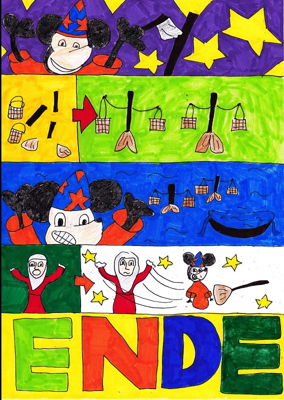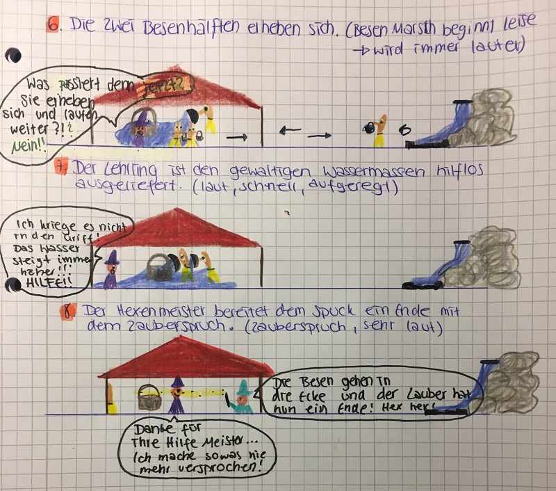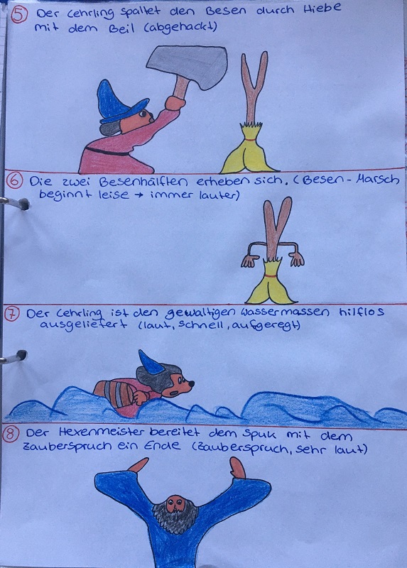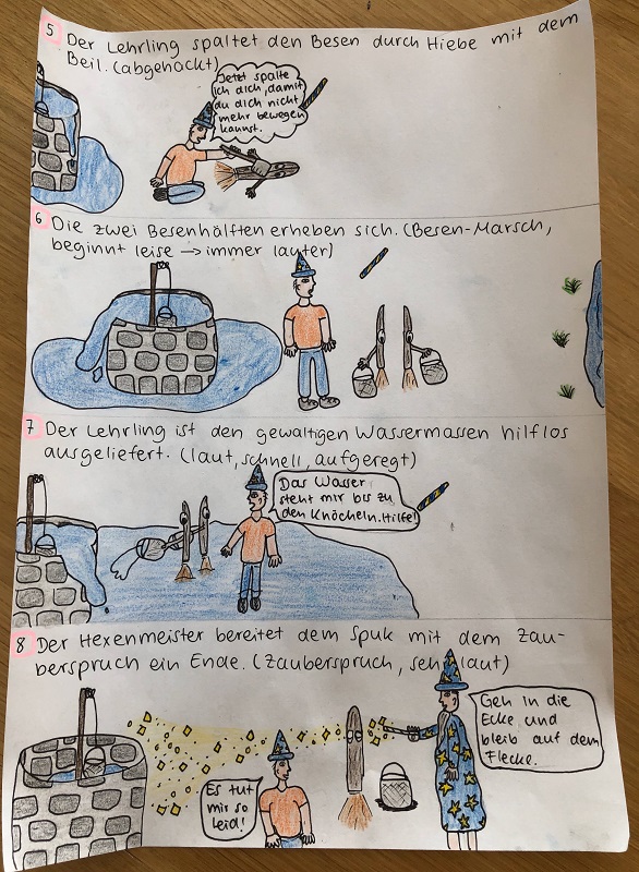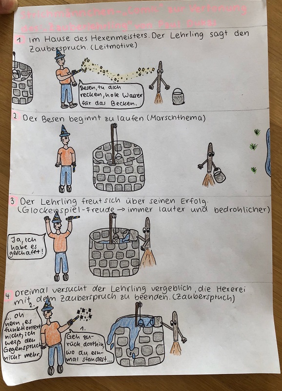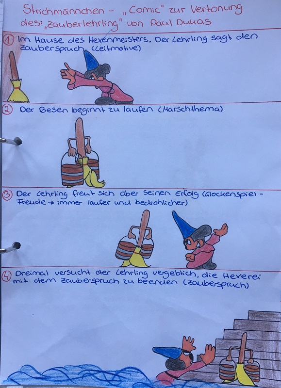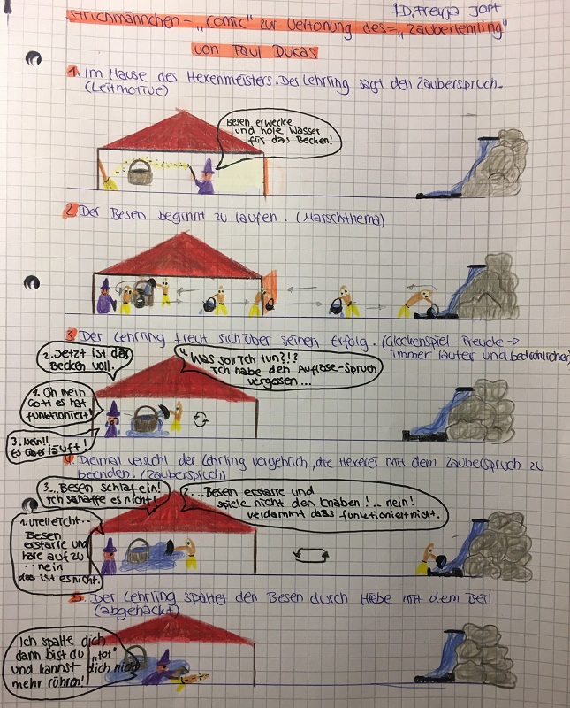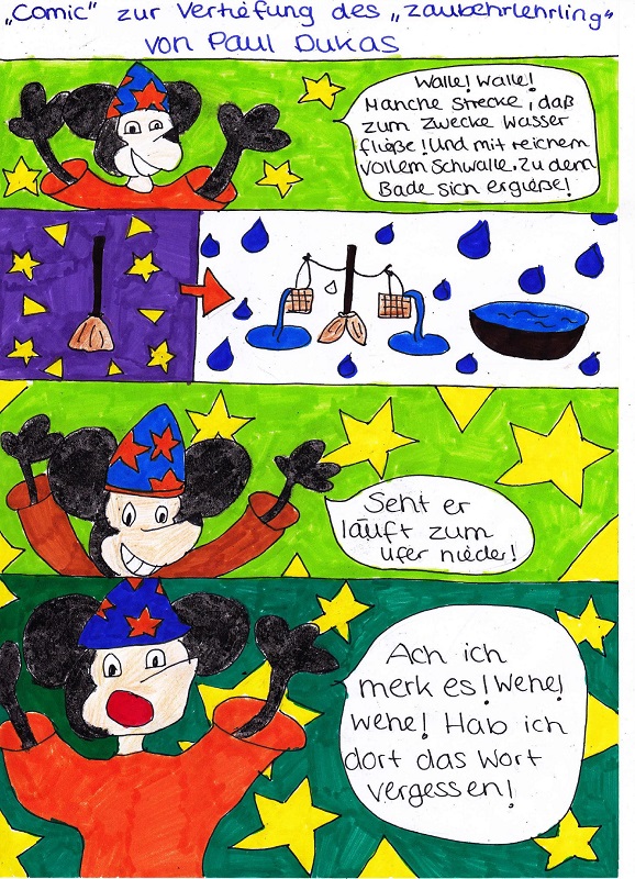 "In den letzten Wochen haben die Klassen 7B und 7D sich viel und intensiv mit der Ballade „Der Zauberlehrling“ mit Text von Johann Wolfgang von Goethe und der Vertonung, komponiert von Paul Dukas, beschäftigt. Eine der Aufgaben war, einen Comic zu dieser Ballade zu zeichnen. Mir hat die Vertonung gut gefallen, weil die Musik die Ballade perfekt widerspiegelt. Ich finde auch, dass die Leitmotive, welche die Personen oder Ereignisse charakterisieren, sehr gut gelungen sind, da die Musik die Emotionen und die Spannung der vier Charaktere, welche das Wasser, der Besen, der Lehrling und der Zauberspruch sind, sehr gut darstellt. Ebenso finde ich, dass man durch die Musik die Ballade viel besser versteht."