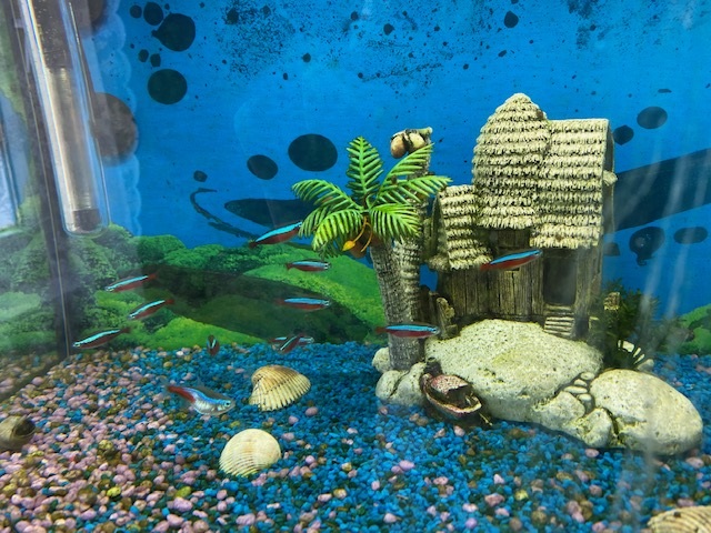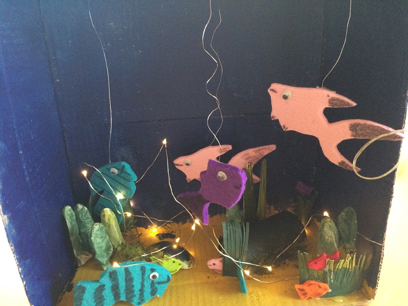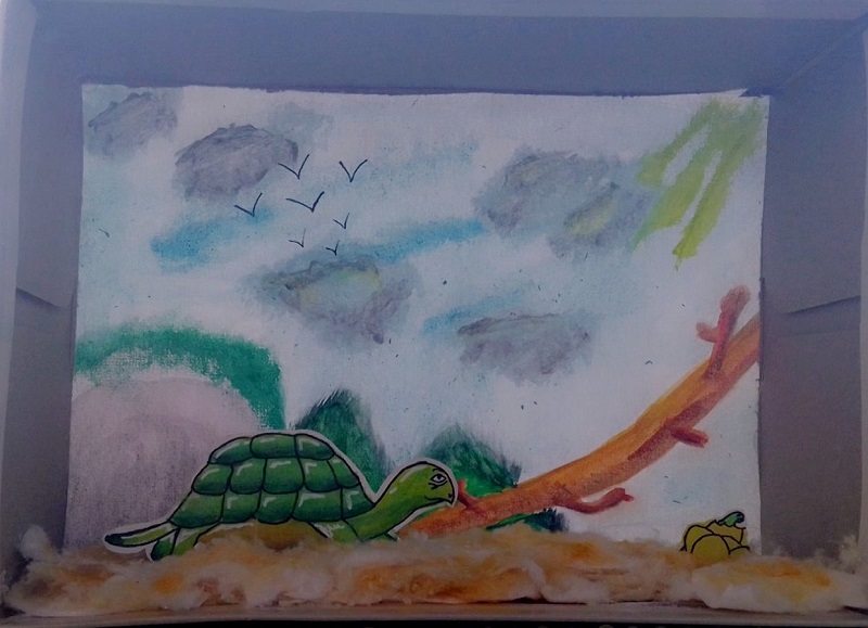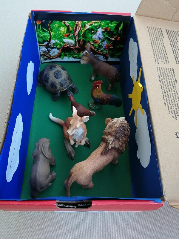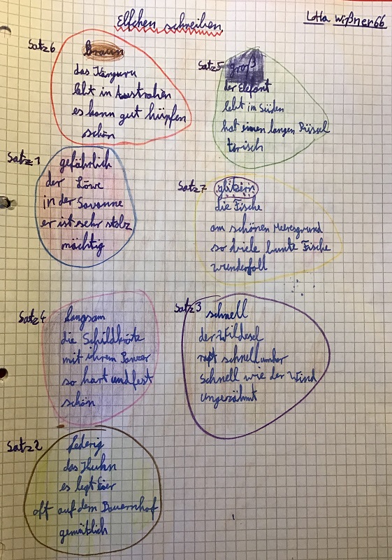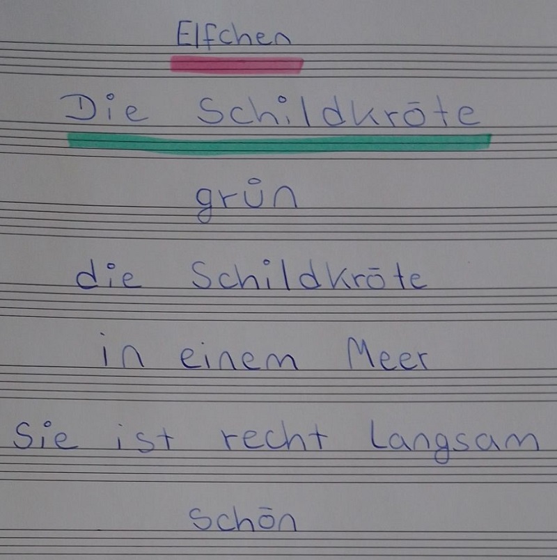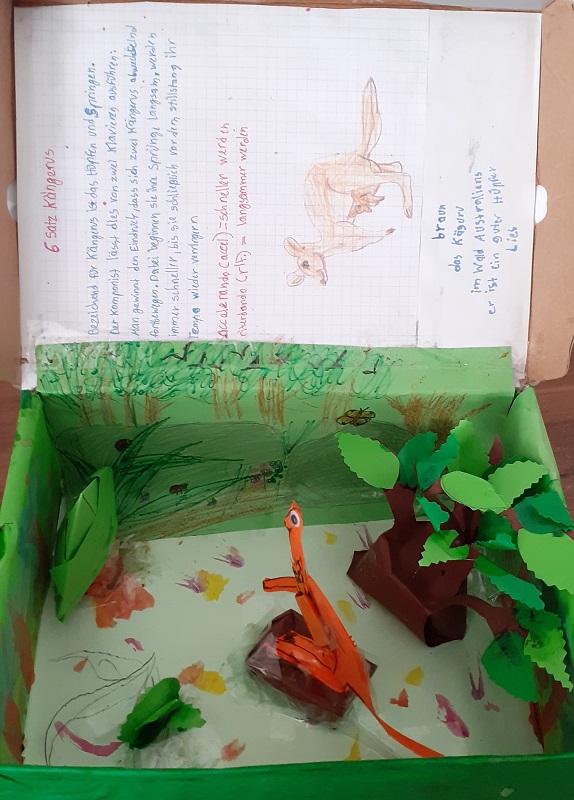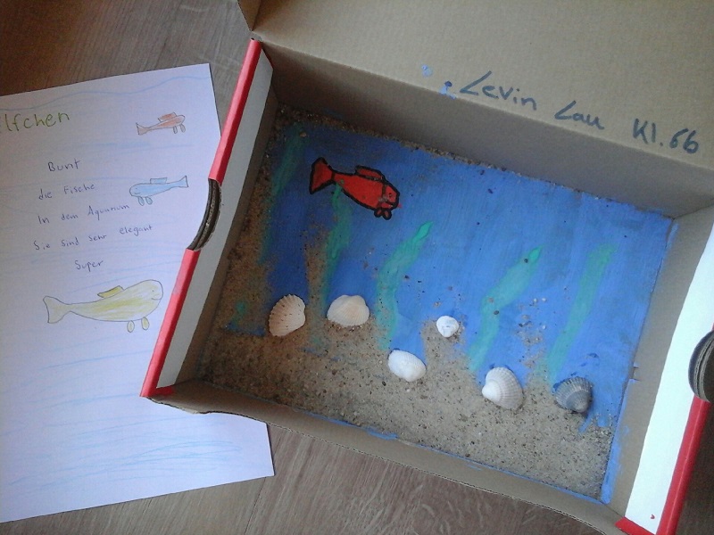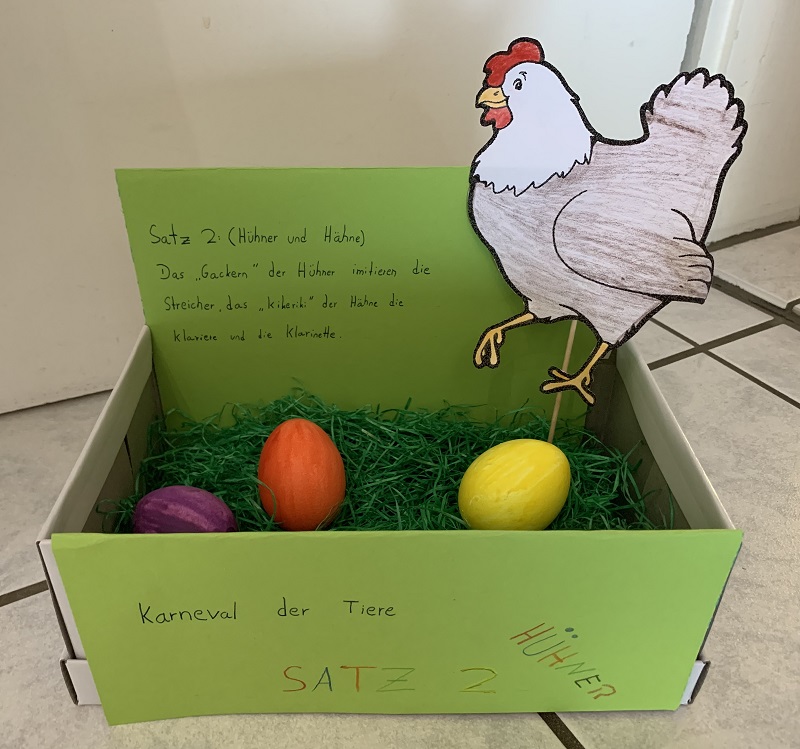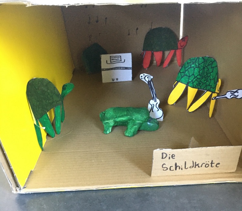 "In dieser Programm-Musik kommen 14 einzelne Stücke vor, von denen wir die ersten 7 bearbeitet haben: Der Löwe, die Hühner, der Wildesel, die Schildkröten, der Elefant, die Kängurus, das Aquarium. Unsere Aufgabe war es, zu jedem Satz ein Bild zu malen und die Musikstücke anzuhören. Dann haben wir die Musik untersucht auf Fachbegriffe, Instrumente und Takt-Abschnitte. Am besten gefiel mir die Melodie vom „Aquarium“. Aber am meisten Spaß hatte ich, als ich eine Glasharmonika mit verschiedenen Weingläsern nachgeahmt habe."