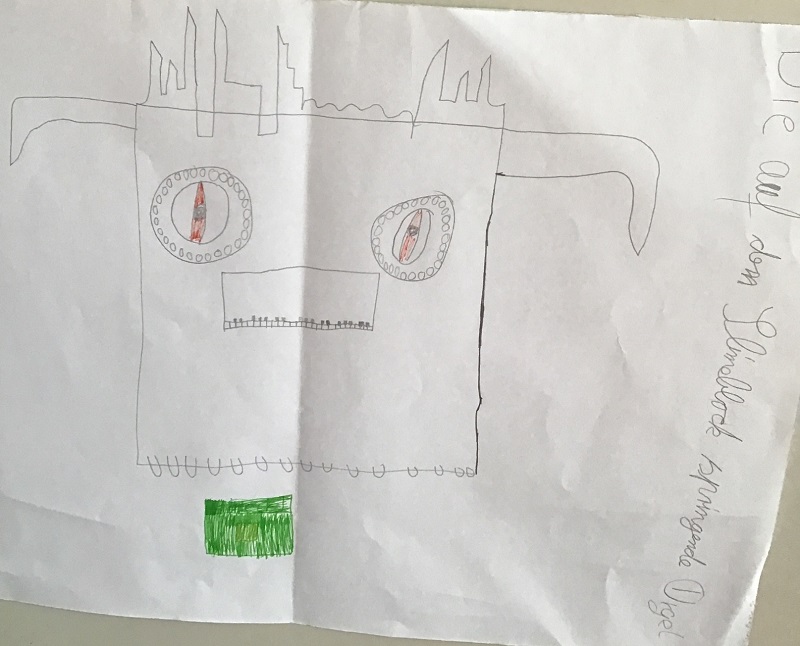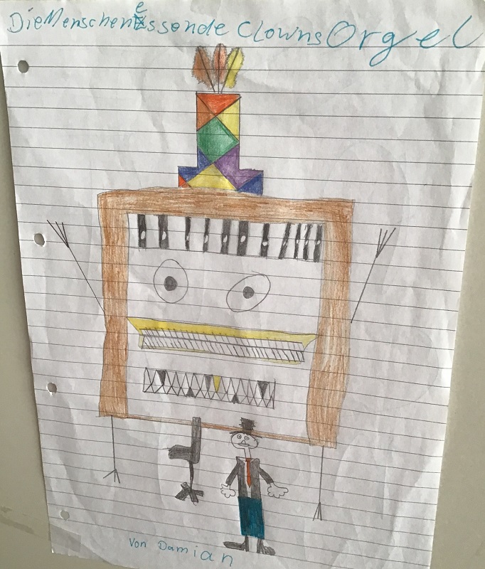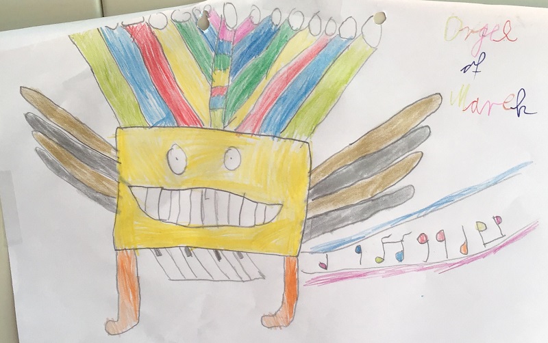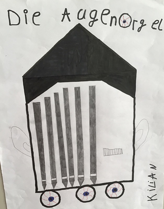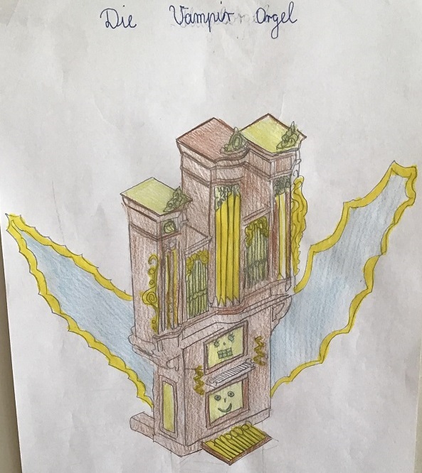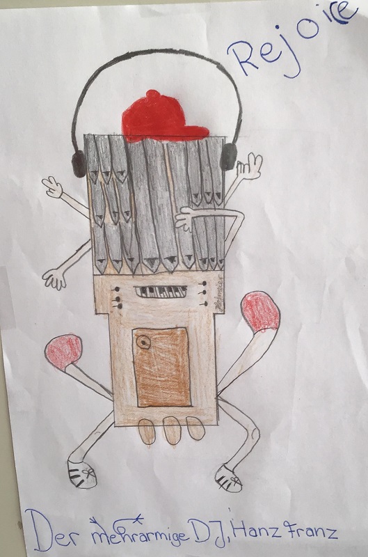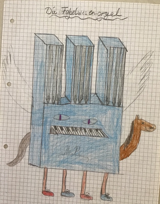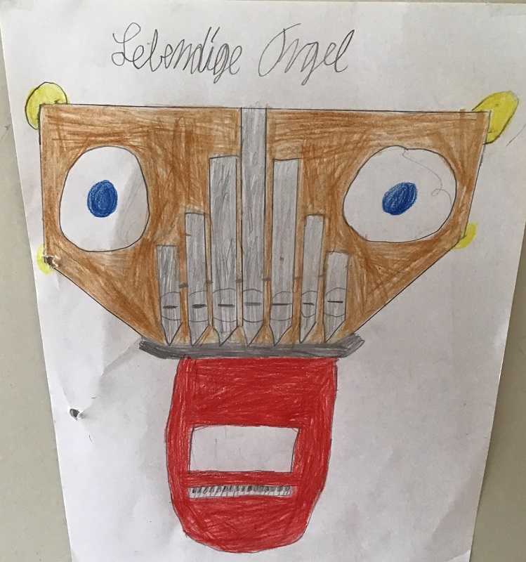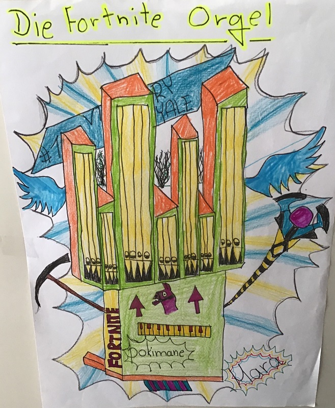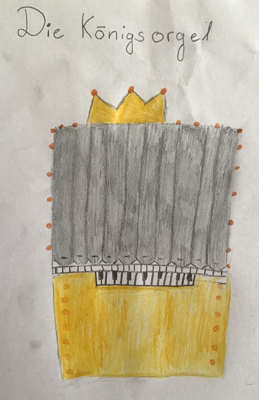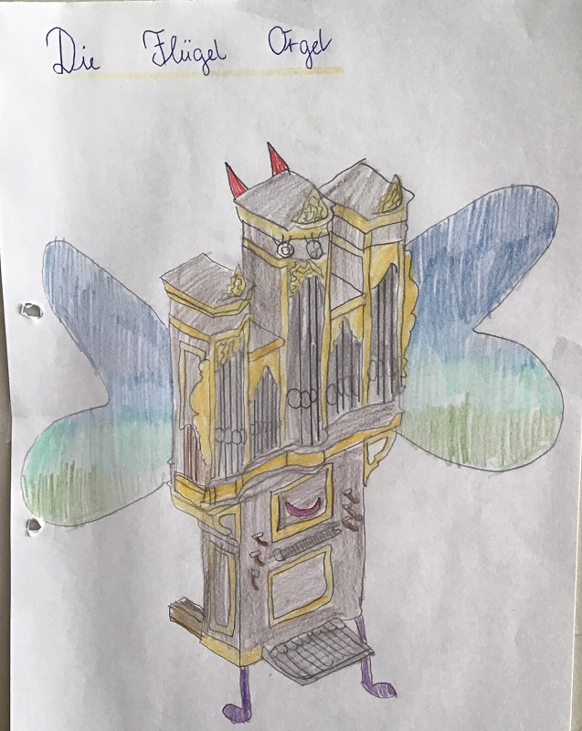 Wir haben uns im Musikunterricht mit der Orgel beschäftigt. Dazu haben wir uns die Toccata und Fuge, ein sehr bekanntes Stück von Johann Sebastian Bach, angehört und den Bau einer Orgel kennengelernt. Dann hat Frau Weithoff vorgeschlagen, dass wir selber Orgeln malen, aber nicht irgendwelche Orgeln, sondern ganz verrückte Orgeln. Die Orgeln durften wir dann entspannt zu Hause malen und sie mit zur Schule nehmen. (Rejoice Awate, Klasse 5c)