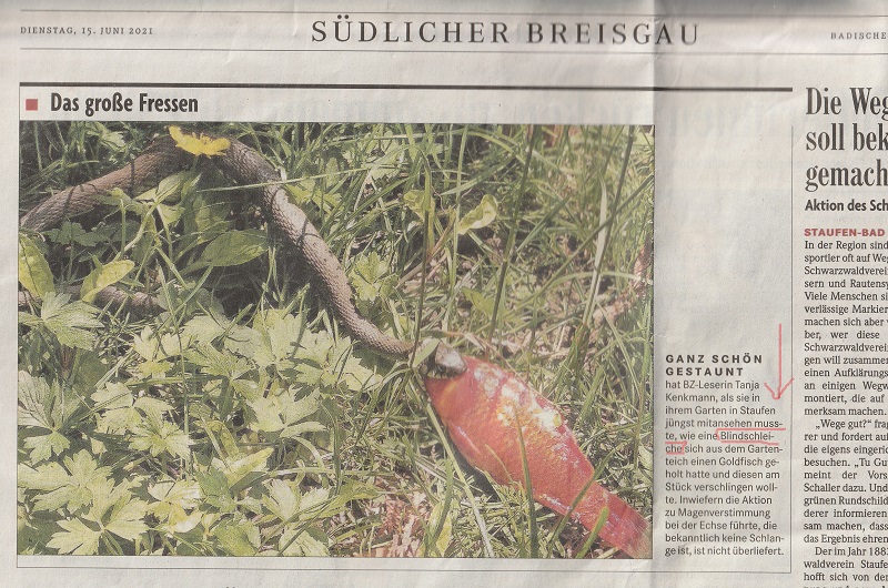 Ich heiße Carla und bin 11 Jahre alt. In Biologie haben wir das Thema Reptilien. Darunter sind auch die Schlangen. Unsere Biologie-Lehrerin ist dann mit ihrer Zeitung vom 15.06.2021 in die Klasse gekommen und hat gefragt, was das für eine Schlange ist. Weil ein Grashalm über ihrem Nacken war, konnten wir nicht sehen, ob es eine Ringelnatter ist. Und dann haben wir uns mit dem Thema Schlangen auseinandergesetzt. Sie haben in Ihrem Artikel geschrieben, dass es eine Blindschleiche ist. Aber hat eine Blindschleiche in regelmäßigem Abstand zwei Punkte als Muster? Nein! Eine Blindschleiche hat zwei lange Stiche als Muster. Also ist es keine Blindschleiche, sondern eine Ringelnatter.
