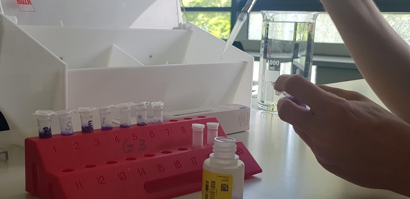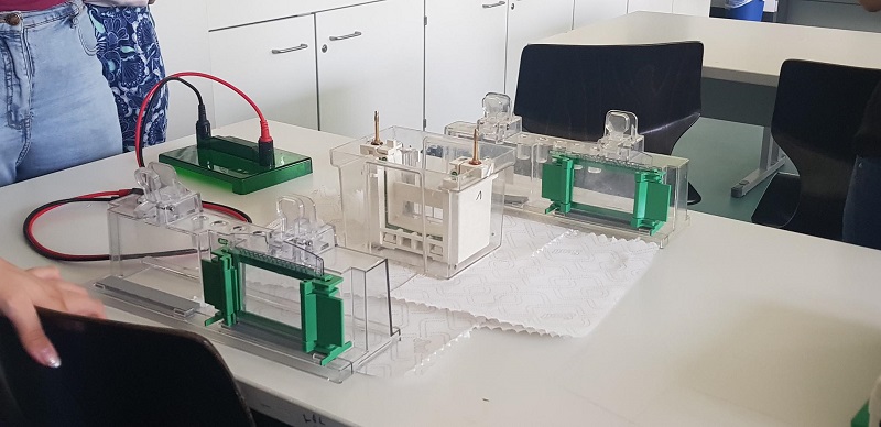 Dazu mussten wir hochkonzentriert sein, um nicht zu zittern, da diese Taschen sehr klein waren. Dann wurde eine elektrische Spannung so angelegt, dass sich der Pluspol am entgegengesetzten Ende befindet. Da die DNA in wässriger Lösung negativ geladen ist, bewegten sich die Moleküle zum positiv geladenen Pol hin. Kleinere Moleküle haben sich schneller durch die Poren des Gels als größere Moleküle bewegt. Wir konnten das natürlich nicht mit bloßen Augen erkennen, aber es hat sehr stark geblubbert. Nach einer 30-minütigen Pause kamen wir zurück, und die Spannung war abgeschalten, da sich die kleinen Moleküle wahrscheinlich bereits schon am Ende der Laufstrecke befunden haben.