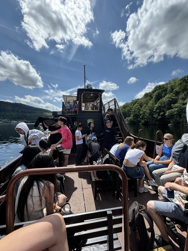 Die etwa zweieinhalbstündige Wanderung führte dann durch den hier besonders malerischen Schwarzwald und bot uns fantastische Ausblicke auf das Umland, den chinesischen Schülern gefiel besonders die Aussicht sehr. Unsere Partnerstadt Hangzhou liegt in der Boom-Region mit Shanghai und Suzhou. Zusammen mit dem Freihandelsbereich Pudong ist dieser Raum die größte Wirtschaftsregion Chinas, in der viele Unternehmen wie auch der Tunnelbauer Herrenknecht arbeiten. Hierzu ist der Schwarzwald natürlich ein großer Kontrast. Mittags stärkten wir uns mit einer traditionellen deutschen Nudelsuppe, die allen recht gut mundete und erholten uns ein wenig von den Strapazen des Marschs. Anschließend unternahmen wir eine Bootsfahrt über den Titisee, bei welcher wir alle ein wenig abschalten konnten, der See mit seiner ruhigen, glatten Wasseroberfläche ist dafür nahezu prädestiniert.