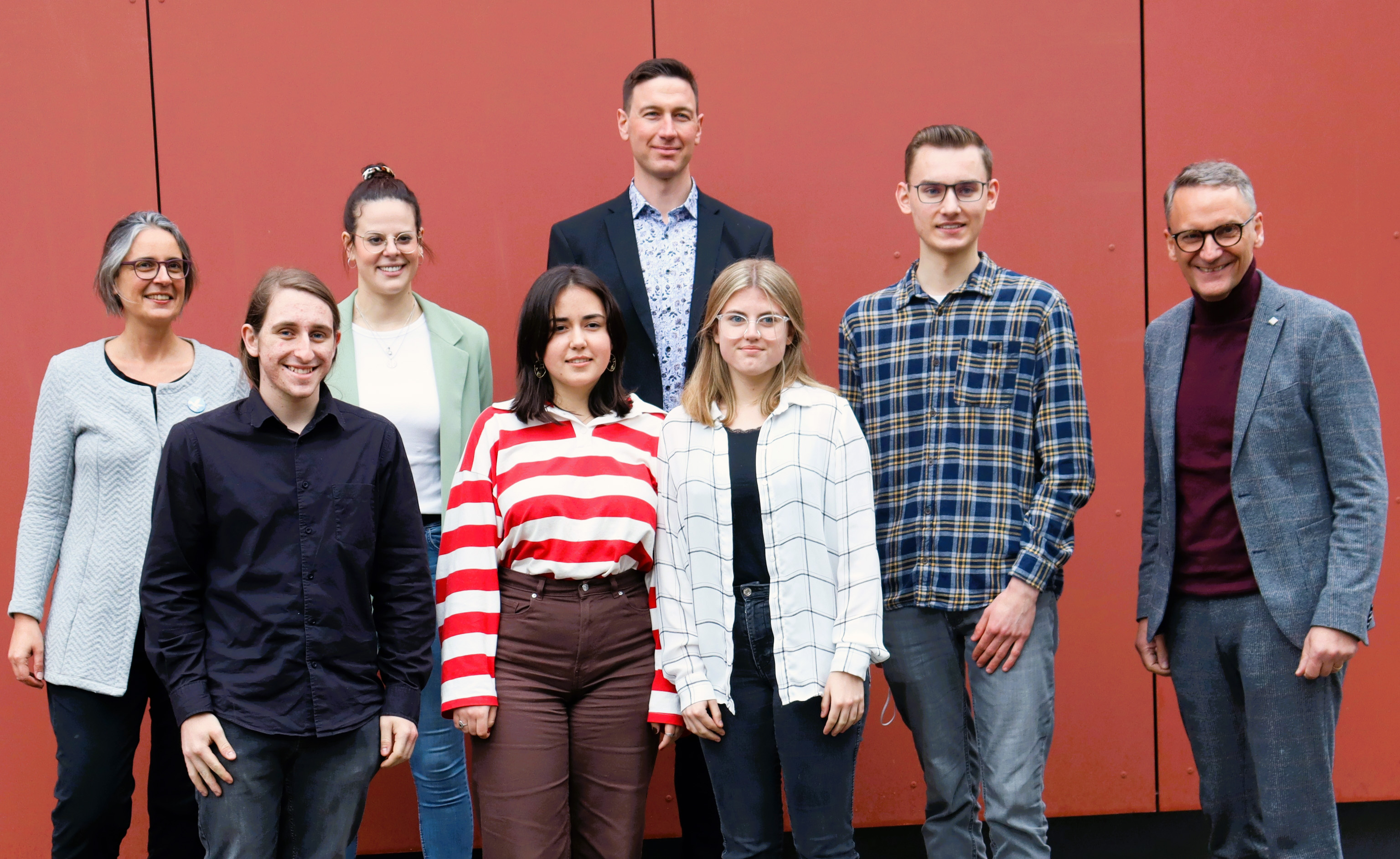Vorstand und Aufsichtsrat der Schülergenossenschaft: Antje Bohnsack (Schulleiterin und Schriftführerin des Aufsichtsrats), Lukas Möller (stv. Vorsitzender), Vanessa Hoppen (Volksbank Lahr, Vorsitzende des Aufsichtsarats), Nura Bodri (Vorstand), Philipp Freykowski (stv. Schulleiter und Projektbetreuer), Chiara Saban (Vorstand), Aaron Marrek (Vorsitzender des Vorstands) und Oberbürgermeister Markus Ibert (stv. Vorsitzender des Aufsichtsrats)