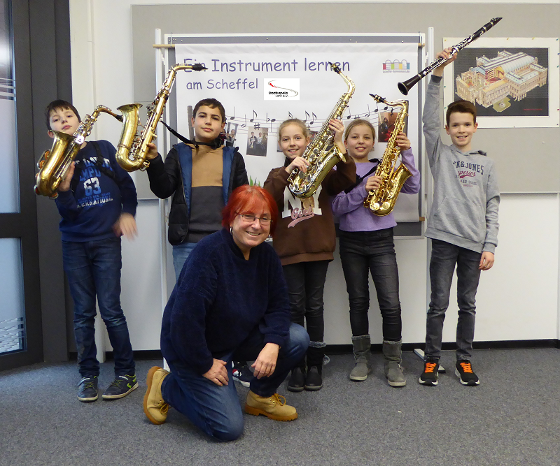 Spaß in der Gruppe, Einbindung in die Nachmittagsbetreuung und kurze Wege – das sind die Vorteile, die Schülerinnen und Schüler haben, wenn sie das Angebot zum Instrumentalunterricht am Scheffel-Gymnasium in Kooperation mit der Stadtkapelle Lahr e.V. nutzen. In diesem Schuljahr nehmen zehn Kinder aus den fünften Klassen daran teil: zwei lernen Klarinette, vier Saxophon, drei Trompete und ein Schüler Tenorhorn. Zwei Sechstklässlerinnen setzen den Klarinetten-Unterricht des letzten Jahres fort. Mit Annette Tafler und Roland Kopp konnten für dieses Angebot zwei engagierte Instrumentallehrkräfte gewonnen werden, die bereit sind, zum Unterrichten in die Räume des Scheffel-Gymnasiums zu kommen.