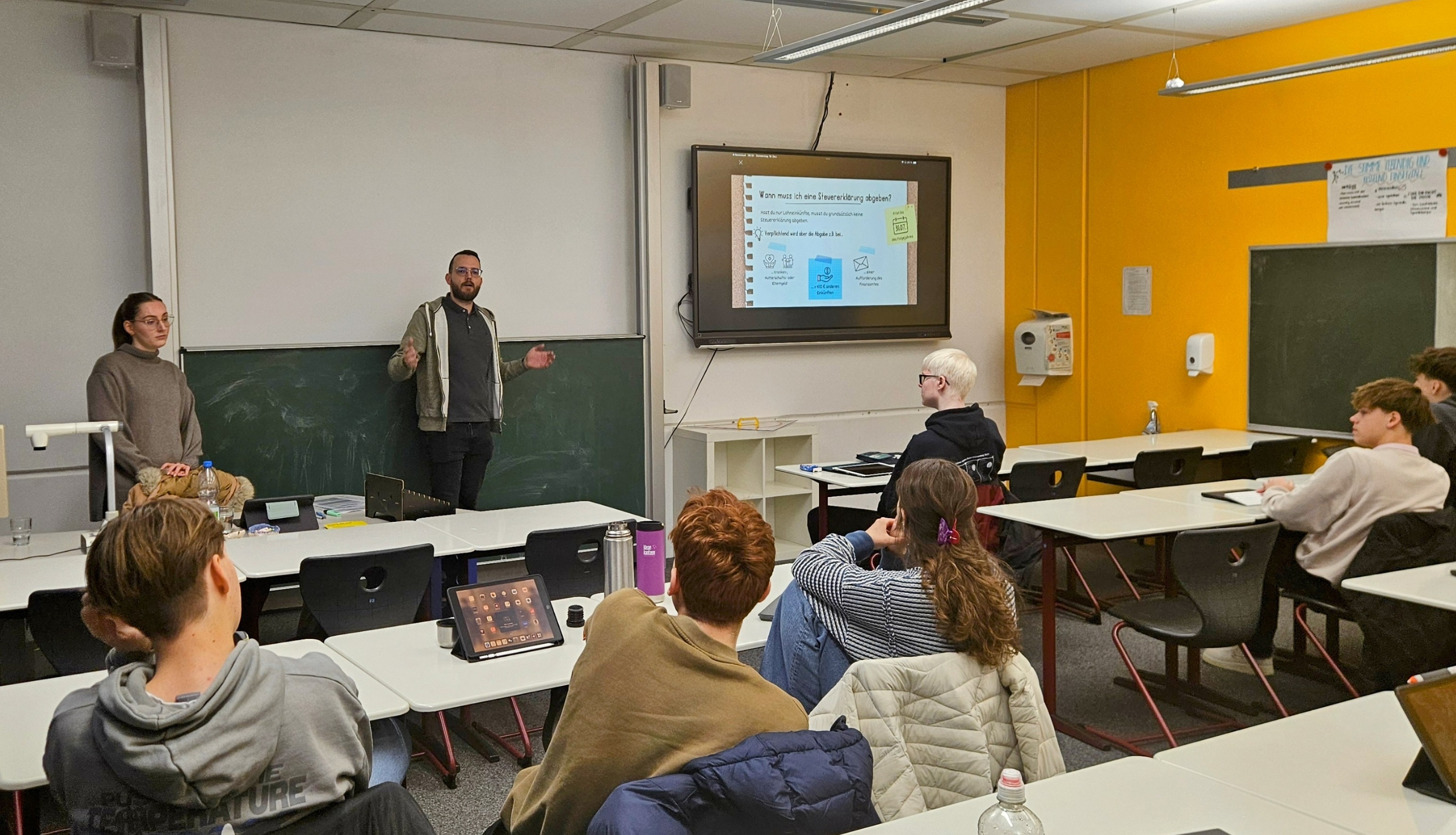 In der zweistündigen Unterrichtseinheit gaben Riethmüller und Schiff den Schülerinnen und Schülern einen umfassenden Überblick über die Funktionsweise des deutschen Steuersystems. Anhand alltäglicher Beispiele erläuterten sie die Notwendigkeit von Steuern und deren Verwendung im staatlichen Gefüge. Besonderes Augenmerk lag auf der praktischen Anwendung: Die Schülerinnen und Schüler hatten die Gelegenheit, unter Anleitung eine einfache Steuererklärung auszufüllen und so erste Einblicke in die steuerliche Praxis zu gewinnen.