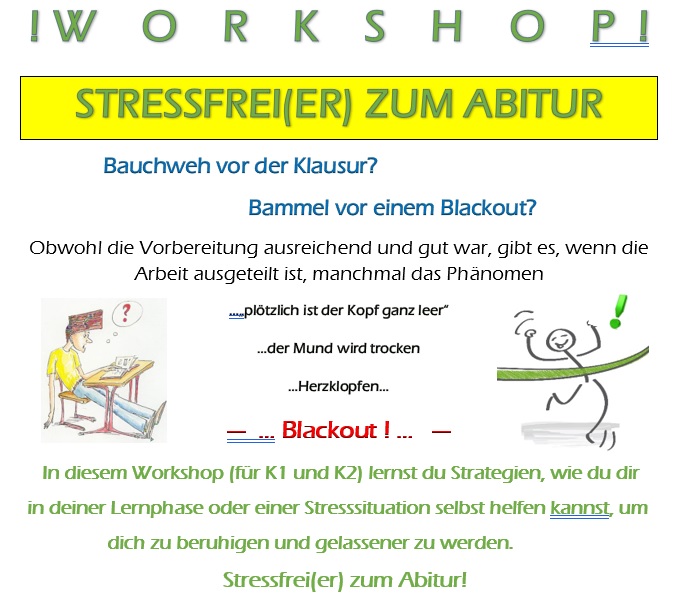 wir bieten in Zusammenarbeit mit Antje Kopf, psychologische Beraterin und Entspannung-Trainerin, an unserem Pädagogischen Tag (10. Februar 2023) erneut einen Workshop „Stressfreier zum Abitur“ an.