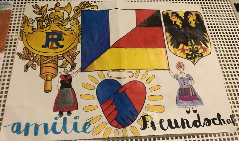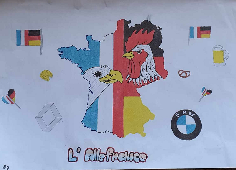 Am 22. Januar 1963 unterzeichneten Charles de Gaulle und Konrad Adenauer den Elysée-Vertrag, der die deutsch-französische Freundschaft nach dem Ende des Zweiten Weltkriegs besiegelte – der Tag wird heute noch als „journée franco-allemande“ gefeiert. Genauso lange besteht tatsächlich schon die Partnerschaft zwischen Lahr und Dole. Im Rahmen der deutsch-französischen Woche vom 22. bis zum 26.1.24 wurde sowohl am Scheffel als auch in Dole fleißig gewerkelt: Es fand ein deutsch-französische Zeichenwettbewerb für alle motivierten Klassen statt, die Arbeiten wurden für eine Woche in der Aula aufgehängt und die besten Arbeiten des Scheffels wurden am 27. Januar nach Dole gebracht: