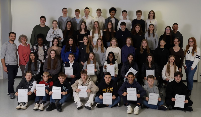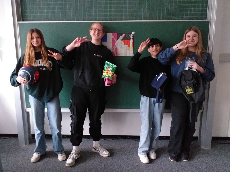 Auf der deutschen Seite das Bild der Klassen 7b und 7d, von Alessia Keil, Luisa Erlewein, Josef Nijim und Melina Rotärmel - hier unsere stolzen Gewinnerinnen: