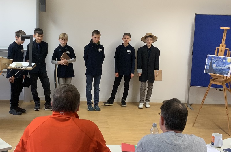 Dabei begeisterte vor allem das live gespielte Trompetensolo der „Scheffelbots“, sowie das erfrischende, live unter der Kamera gelegte „Explainity“ mit den witzigen cut-outs der „Scheffelgirls“. Das Junior-Team des Scheffels (Danny Root, Marc Jäger, Emil Kettering, Aaron Schneble, Till Piepenbreier und Fynn Gänshirt) konnte beim Wettbwerb erste Erfahrungen sammeln, erntete ebenfalls viel Lob für die äußerst lebendig vorgetragenen Recherchen zum Thema „Kunst und KI“ und ließ sich trotz einiger technischer Probleme während des Tages nicht den Spaß verderben.