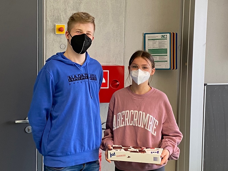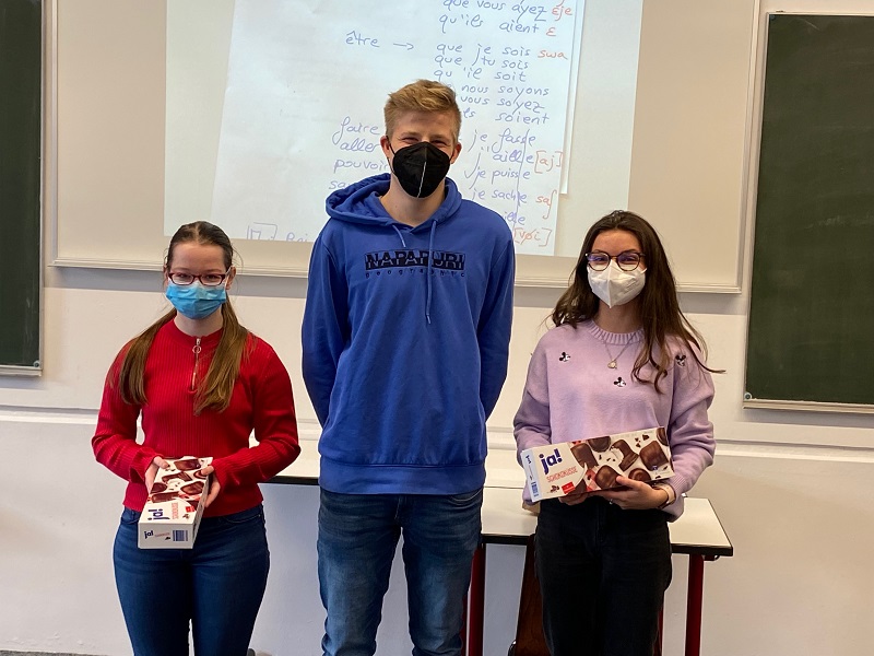 Den ersten Platz der Jury erreichten Sabrina und Helene (9d), die ein, so Jurorin Jette, "sehr gut visualisiertes Video in [sehr] gutem Englisch" erstellt hatten. In der Biostunde von Herrn Fink fand die Übergabe der schokoladigen Preise statt. Die kurze Laudatio hielt jeweils Ben in wortgewandter und anerkennender Weise.